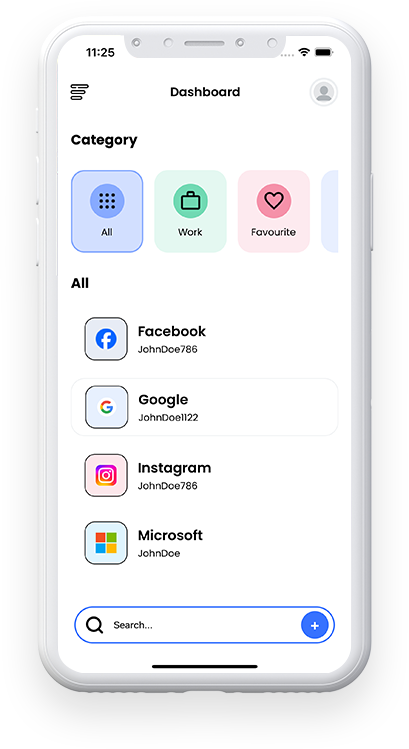 After setting up your PIN and biometrics, conveniently accessible through the bottom plus button on the dashboard screen, adding a new password becomes effortless. Our user-friendly design ensures a seamless experience, allowing you to quickly and securely add passwords with just a few taps.